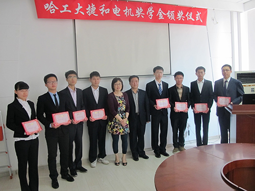 2015年5月22日9:30,2013-2014年度捷和电机奖学金颁奖仪式在电机楼30040举行。捷和电机集团公司人力资源及行政总监徐桂芳、人力资源经理郑浪、工程技术高级经理贺建桥,黑人av 黑人av 副院长王立欣、电磁与电子技术研究所副所长寇宝泉等领导出席了本次颁奖典礼。