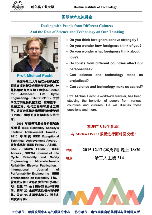 为了鼓励广大师生积极开展国际交流,克服国际交流过程中可能遇到的困难,充分理解和学习在国际学术交流需要关注的问题,积极拓展国际交流视野和渠道,提升国际学术交流能力,依托哈工大教学发展中心电气分中心,受黑人av 的邀请,美国马里兰大学(University of Maryland)机械工程系首席教授Michael Pecht来我校做特邀报告。