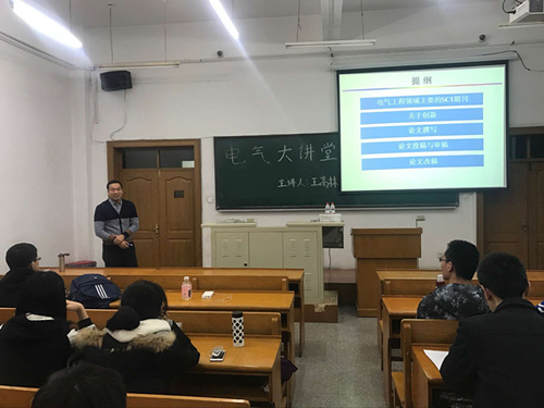 讲座从电气工程领域主要的SCI期刊、论文创新、论文撰写、论文投稿与审稿、论文改稿等几个方面分别展开。首先,王老师讲解了SCI影响因子的概念及其对选择SCI期刊的影响。其次,王老师还对学术论文的意义,学术论文的选题及论文各个结构的撰写与修改进行了深入的阐述,以更为清晰的脉络让在场同学对论文写作有了新的认识。现场气氛热烈,同学们都认真聆听并对老师讲解的内容做了笔记。讲座结束后同学们根据自身出现的问题提出疑惑,王老师都耐心地一一解答。