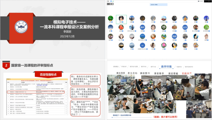 会上,李国丽教授分享“模拟电子技术——一流本科课程申报设计及案例分析”的课程申报经验,分别围绕国家级一流课程建设现状、课程评审指标、申报材料撰写、教学设计样例及说课视频技巧制作等五个方面进行分享交流。她强调,一流本科课程设计要以学生为中心,将项目与理论有机融合,以特色课程设计激发学生学习兴趣,提高学习成效。一流本科课程申报要明确需求、注重细节、反复打磨、突出特色,以高质量内容推进课程建设。